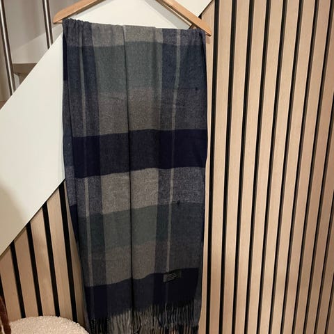 Skjerfet er ulikt mønstret i ulike grønn- og blåfarger mm. Er ikke sikker på om det det er ren ull eller blanding av ull og bomull el likn. Det er 90 cm bredt og 180 cm langt.