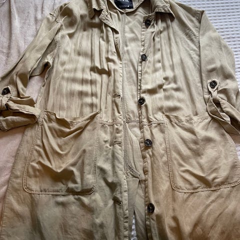 Lys beige / kremfarget kåpe i lett materiale. Str 34. Ser ut som ny.