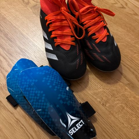 Adidas Fotballsko str 32 , leggbeskyttere og sokker brukt 2 ganger. Ingen bruksmerker. Passer 7-9 år.Kjøpt på sport 1