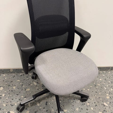 Farge: Trekk på sete i grått stoff og rygg i sort mesh