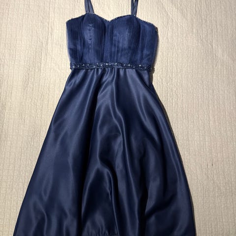 Blå glitterkjole fra WalG. Tynne justerbare skulderstropper. Utsvinget skjørt.
