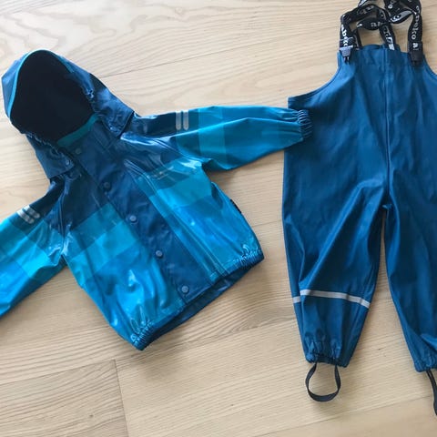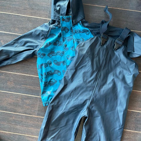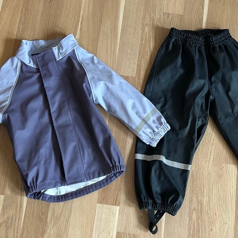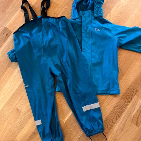 Regntøy (bukse og jakke) fra Color Kids i strørrelse 92-98. Litt liten i størrelsen så nærmere 92. Brukt av et barn. Strikkene under bena er slitt, men disse kan byttes. Ellers i fin stand.