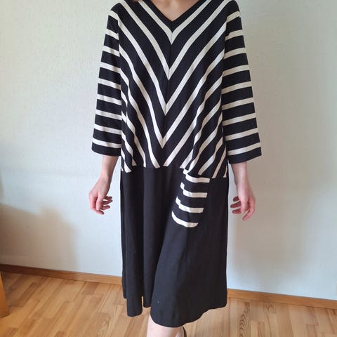 Ny Masai-kjole i 100% Viskose. Flott og lett stoff. Litt volang nederst på arm og skjørt. Søm i midje bakside kjole. Kupp- pris da dette er en dyr kjole, men ikke min størrelse lenger.