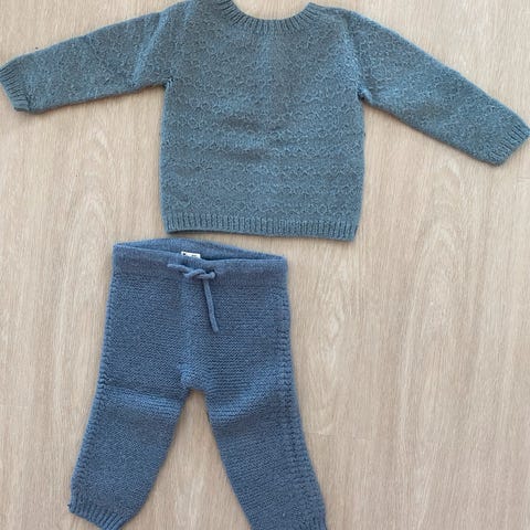 Hjemmestrikket rillesett bestående av genser og bukse i grønt og hvitt selges.