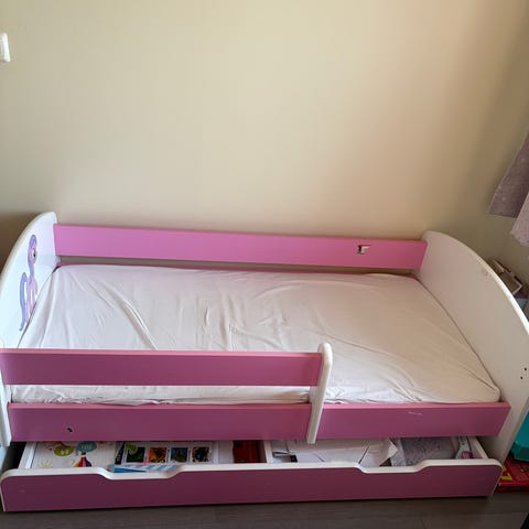 Solid seng kjøpt på Nohus. Maderass er noe flekket, men i god kvalitet og kan følge med. Praktiske skuffer under senga. Senga kan dras ut til dobbelseng, da trenger du kun å skaffe ekstra maderass. Har to like seng. Pris per stykk.