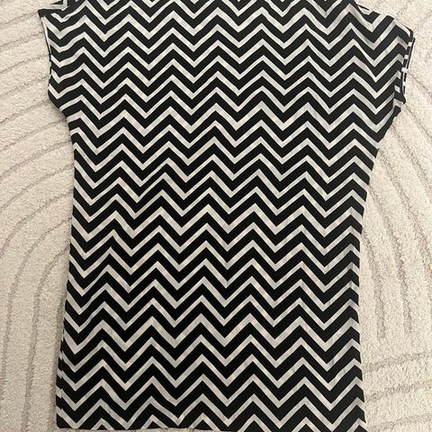 Topp med møster i fine farger. Henger løst på kroppen - stor i størrelsen. 95 % polyester