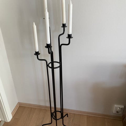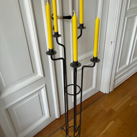 Dekorativ og stemningsskapende gulvlysestake i grått metall, 106 cm høy. Plass til seks lys. Håndlaget.