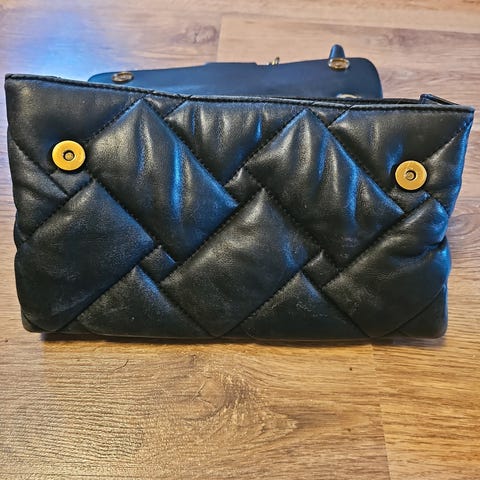 Selger en pent brukt veske i sort skinn med gulldetaljer fra Kurt Geiger. Avtagbar lenke, så den kan også brukes som clutch. En flekk i én av lommene og noe slitasje på lenka (se bilder), men ellers fin.