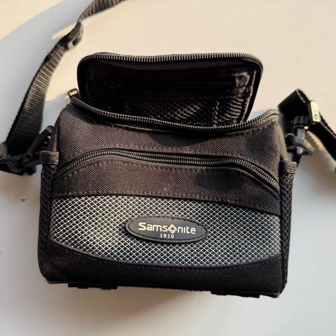 Praktisk, polstret kameraveske fra Samsonite. Passer til systemkamera, med plass til en ekstra linse. Avtagbar skulderrem, og magebelte. Godt utstyrt med lommer.