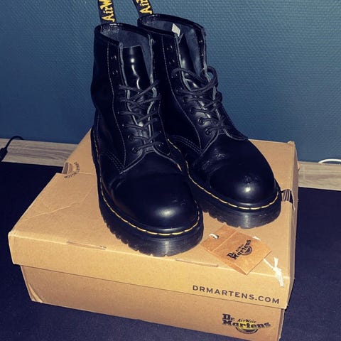 Pent brukte, godt vedlikeholdt Dr.Martens høy støvel med ståltupp.