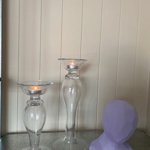 2 stk Koboltblå lysestaker i glass selges samlet for 100kr. Den ene staken har fått et skår (se bilde 3).