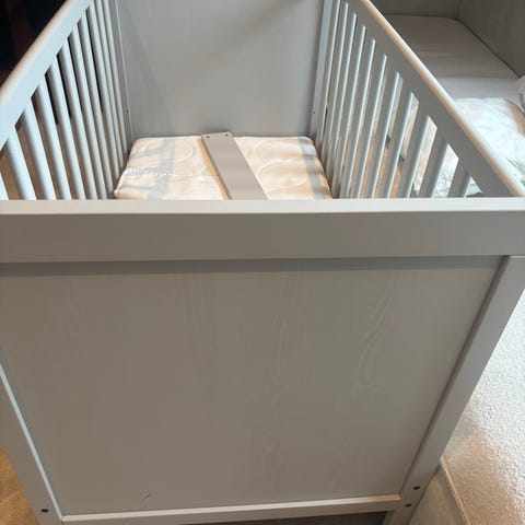 Sprinkelseng med forskjellige høyder muligheter. Helt ny madrass fra babydan og sprinkelseng beskytter, som er så og si ubrukt da eieren av sengen fortrekker å sove med mor følger med. Liten skade på benene, men har ikke noe og si for funksjon eller sikkerhet. Resten av sengen ser bra ut.