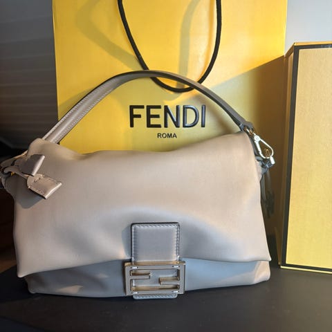 Fantastisk Fendi veske! Vesken er i svært fin stand. Det er ingen bruksmerker i stoffet. Skinnremmen er pen. Små brukstegn på hardware. Ren og fin innvendig. Superfin Fendi veske som gir antrekket det lille ekstra!