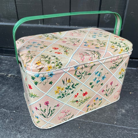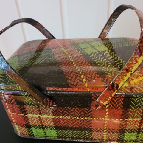 Smørbrødboks/ kakeboks fra 50-tallet. Alle tre brett i boksen er inntakte. Hel og fin boks med lite bruksslitasje.