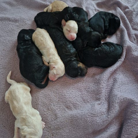 Daisy og Bruno fikk tre valper den 22. januar. Vi har to hannvalper ledig. Leveringsklare fra 20. mars. Daisy er cockapoo F1B og Bruno er cockapoo F1. Begge er 3,5 år, og de veier ca 5 kg. Rutinemessige helsesjekker av foreldrene er tatt, bl.a sjekket for patella og øyelyst, Alt ser fint ut. Se vedlagt bilder av attester. Hundene er snille og veldig familievennlige. Inkludert i prisen til valpene er helsesjekk, vaksine, ormekur og chip. Vi bor på Klepp i Rogaland. Send gjerne melding om du er interessert. 😊