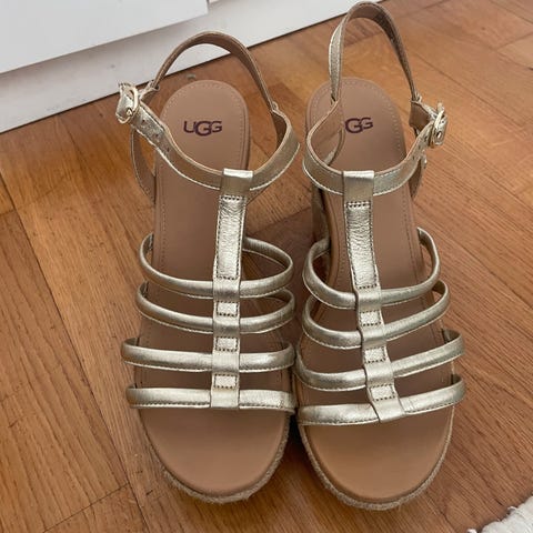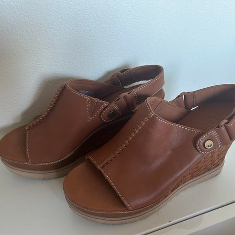 Ugg sandaler med høye hæler, prøvd noen ganger innendørs men aldri ute.