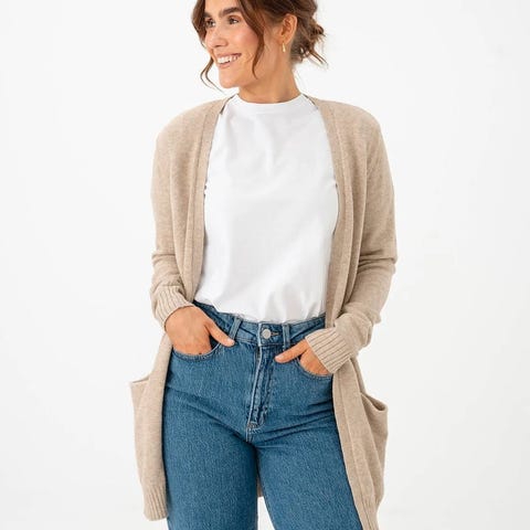 Flott, ribbestrikket cardigan i 100% yak som er like fint som kashmir. Jakken er uten knepping og har sjalskrage. Den er veldig anvendelig og kan brukes både som en cardigan og som en lett ytterjakke når det er varmere i været. Jakken blir mykere og mykere ved bruk, og den er i høstens fineste farge 🤎
