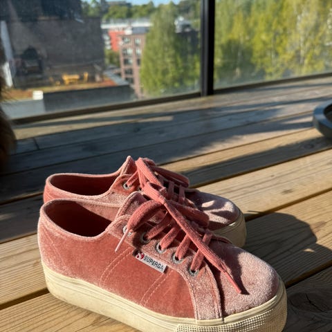 Platå superga i fløyel, skitten og sliten ytter såle. Pen rosa fløyel med få bruksmerker. Innersålen har nesten ingen bruksmerker da jeg har hatt egne tynne såler i.