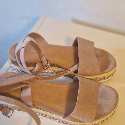 Selger et par svært lite brukt sandaler med yndig blomsterdekor på rista. Sandalen har en praktisk elastisk rem som holder den på plass på foten. Se bildekarusell.