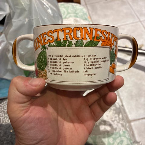 Fem kopper H: 6,5 cm D: 6 cm med skål D: 13 cm selges i sett kr. 300,- pr. sett (kopp+skål). Seks asjetter D: 17,5 cm kr. 250,- pr. stk. Alle delene er i fin stand, med friske farger og intakt gullkant, har kun få svake bruksspor og blank glasur.