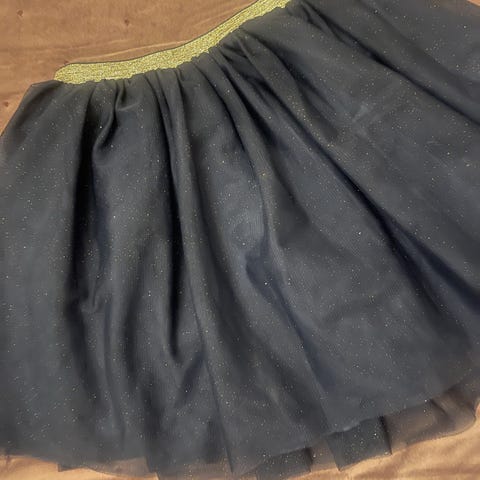 Skjørt i metallic. Glitter og svart strikk i livet. En liten skade (se bilde 3). Flott til julen.