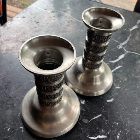 To stk lysestaker i tinn, stemningsskapende og tradisjonsrike, hele og fine under.