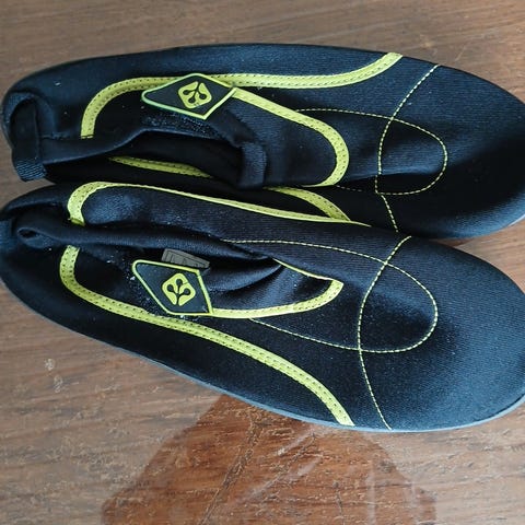 Mørkeblå vannsko med lysblå såler. Str. 35/36