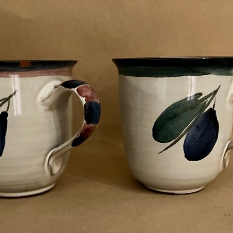 Fem stykk eldre tekopper / kaffekopper i blålig fargetoner. Normale bruksspor, men ingen stor slitasje tross bruk/alder. Selges kun samlet. Rimeligste frakt er 70 med Postnord utenfor Fiks Ferdig.