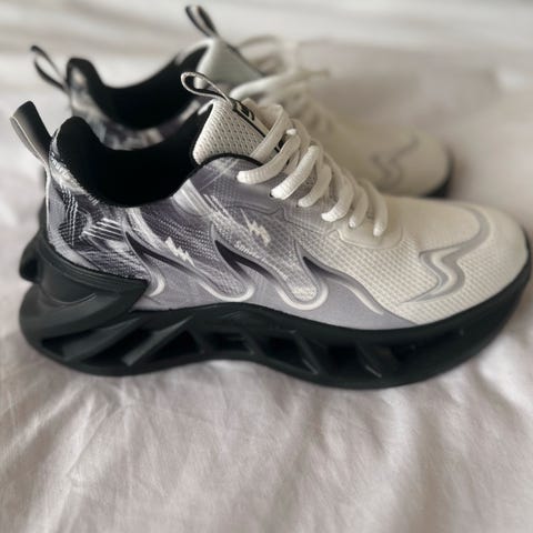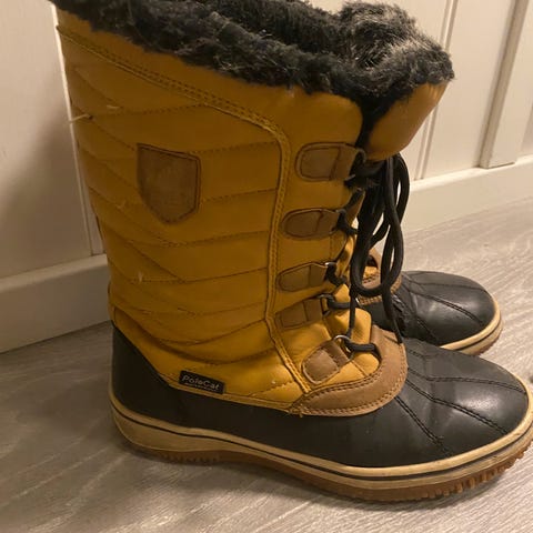 Skoene har merker på det hvite, men kan sikkert pusses med hvit skopuss. De er også litt slitt inni, så brukes best med ullsokker.