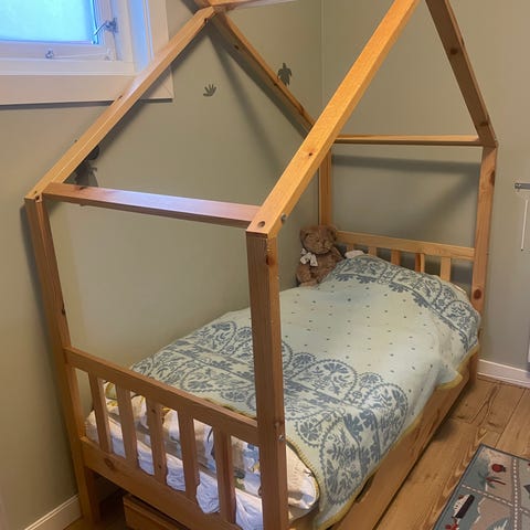 Koselig Husseng med hjul, uttrekkbar ekstraseng under sengen. Som ny, selges på grunn av flyting.