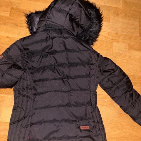 Nydelig tykk, sort Kjus dunkåpe med innsving og avtagbar hette selges. Lite brukt og ingen bruksmerker. Deilig og varm spesielt siden den går under rumpa :-)