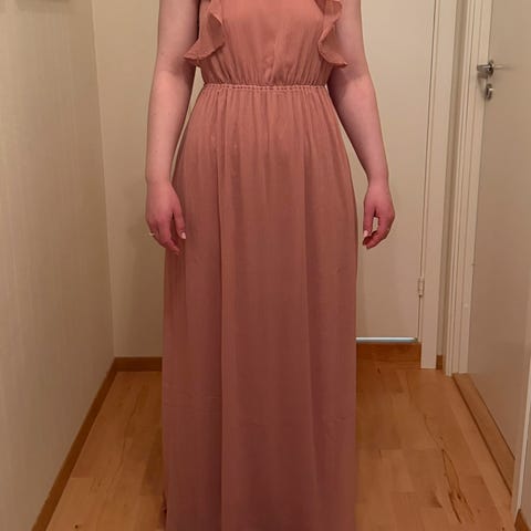 Nydelig lang rosa kjole i 2 lag,åpen rygg str. 36 selges for 200 kr. Den er ikke brukt,lappen henger på.