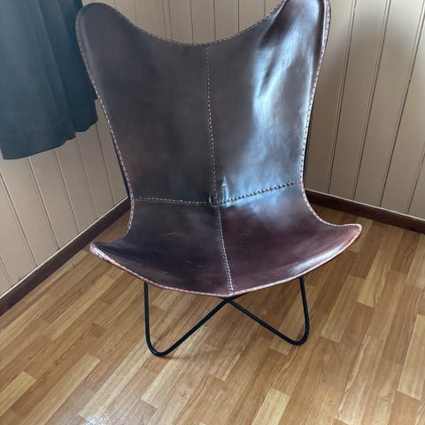 Vår sommerfuglstol i gammeldags stil i ekte lær har blitt ergonomisk designet for full avslapning etter en travel dag. Det ikoniske sommerfugldesignet er veldig populært og passer til enhver innredning.