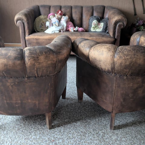 Rydder på låven. Selger denne flotte antikke sofaen da jeg dessverre ikke har plass . Trenger rens evt skifte av trekk samt feste på pyntebånd .