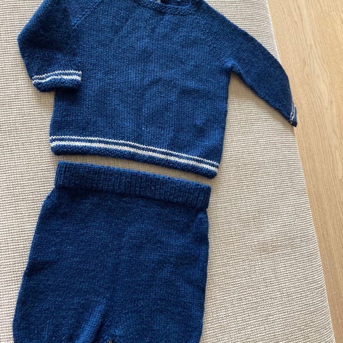 Hjemmestrikket cardigan i ull med hjerteknapper og hjemmesydd seleshorts i velour, ubrukt