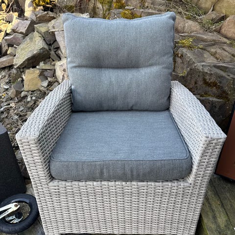 Selger denne hagestolen da den ble overflødig på min balkong. Kjempefin rotting i beige/varm grå farge med sorte ben.