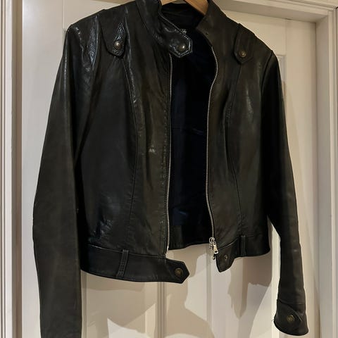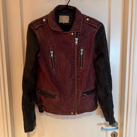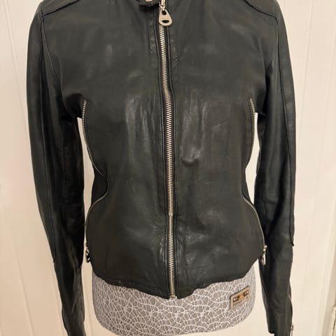 Skinnjakke fra Jofama - av Caroline Roxy. Lite og pent brukt, men med bruksmerker på glidelåsene (se siste bilde).