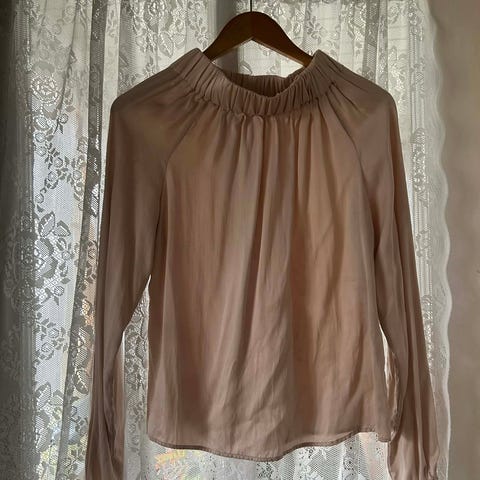 Lekker bluse, men passer ikke meg i fargene. Brukt en gang. Framstår som ny. Polyester. Romslig modell. Dobbel knepping på ermene og i hals med flotte knapper. Skjult knepping foran. Kan sende med fiks ferdig :)