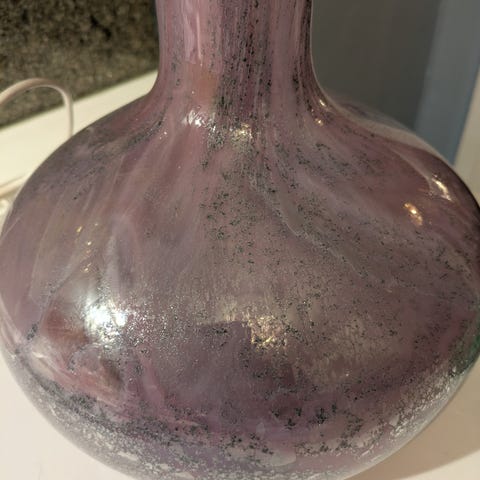 Ser ut som en bordlampe. Kan legge en batteri drevet lyslenke inni kuppelen. Denne er utgått fra leverandør. Sprekk i sokkelen så selges billig.