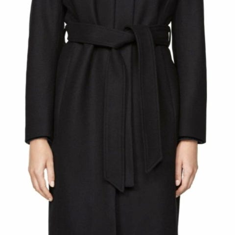 Kåpe i Manteco-ull med maxi-jakkeslag fra Mango. Italiensk ullstoff Manteco. Ullblanding. Midi design. Rett. V-hals med slag. Langt erme med skjortekanter med knapper. To sidelommer. Bånd i livet med knyting. Avtagbart belte. Åpning bak på buksekanten. SAMMENSETNING:60% JOMFRUULL. 25% POLYAMID. 15% ULL.