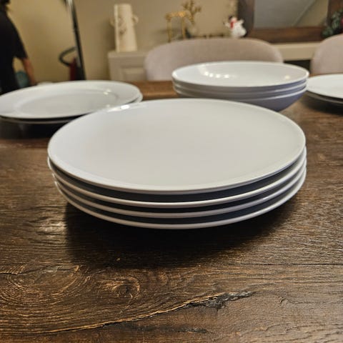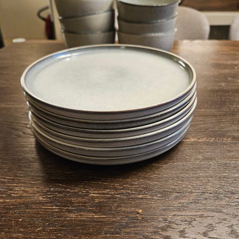 6 stk frokosttallerkner og 4 stk middagstallerkener selges. Flere skår og merker i tallerknene