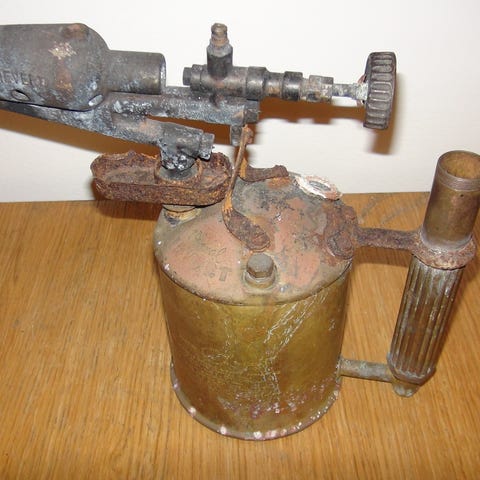 Ukjent merke gammel petroleumslampe i metall med grønn farge. Lampen har håndtak for bæring og en glassbeskyttelse rundt lyskilden. Egnet for bruk som lyskilde eller dekorasjon.