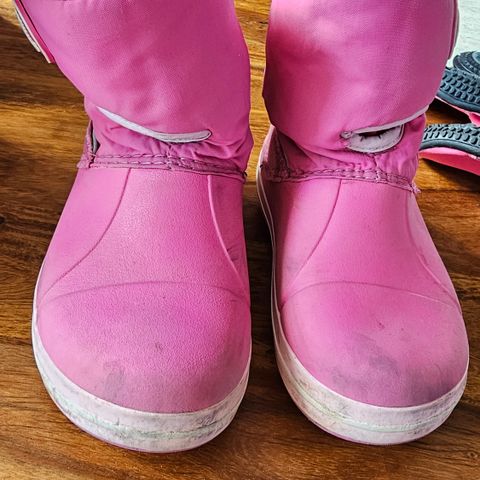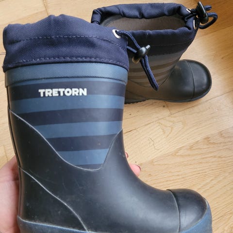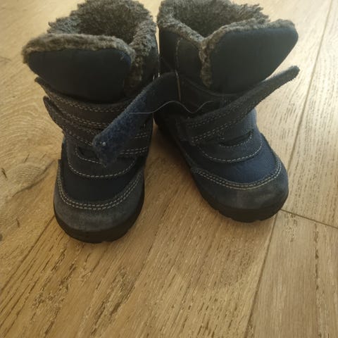 Fôret kule vintersko. Siste bildet kan du se at de er lite brukt under på sålen. Har gått over med en fuktig klut, men er noen mørke flekker på stoffet øverst. Ikke prøvd å vaske de.