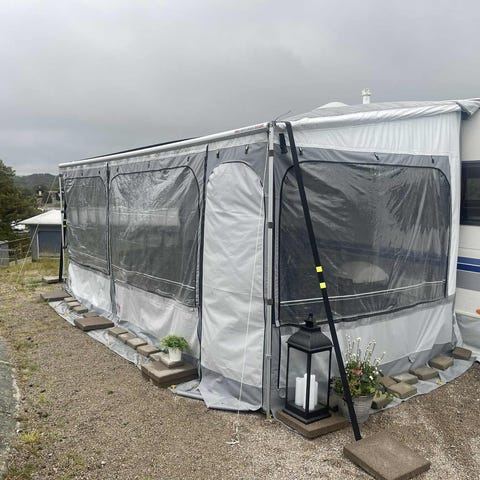 Materialet er et kraftig tekstil kombinert med gjennomsiktige vindusfelt. Forteltet gir et ekstra, skjermet oppholdsareal ved bobil eller campingvogn og kan brukes som sitteplass, spiseplass eller til oppbevaring av utstyr under camping og fricamping.