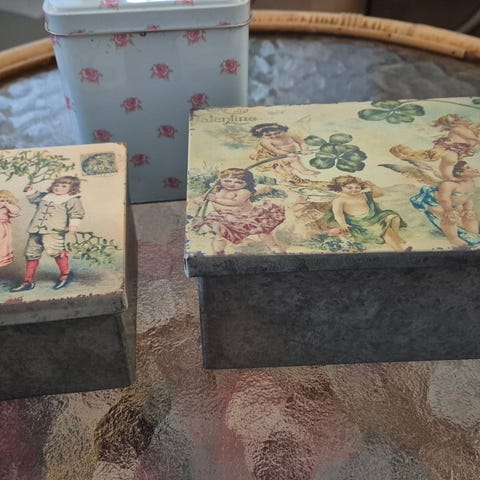 2 stk små gamle blikk esker med lokk "lofferarbeide", selges.