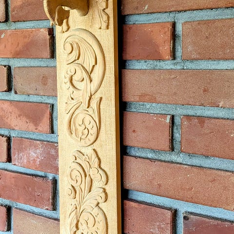 Den med treutskjæringer er 69cm lang og selve tredelen er ca 3 cm høy. Vekt 1300gram.