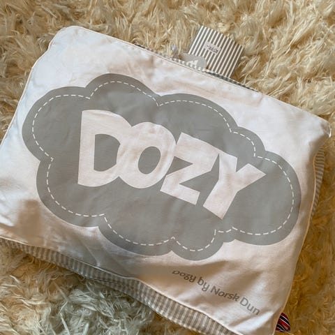 Dundyne og pute fra Fru Lyng. Størrelse på dyne: 130 x 90 cm. Putevar: 55 x 35 cm. Fra et røyk- og dyrefritt hjem.