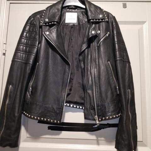 Remain svart skinn bomber jakke str 36 selges for kr 3500,-. Den er helt ny og ubrukt og den kostet kr 8799,-. Mykt deilig skinn med glidelås og skjulte trykk knapper og lommer i siden. Superkul og varm jakke.