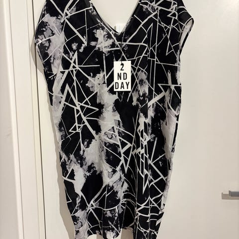 Nyyydelig kjole fra 2-Biz i viskose og silke! Kjempefin som kjole eller brukes over jeans nå på høsten. Pen oversized på mindre str. Selges billig da den har fått en kite forkyvning i en tråd under armen ved brystet. Dette er så og si ikke synlig. Se siste bilde.