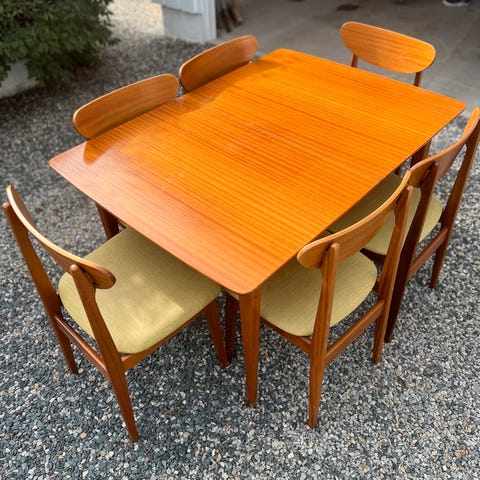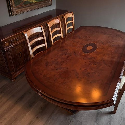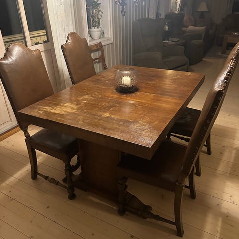 Fint spisebord som ikke er mye brukt, men stått som pynt på stuen. Det kommer med 8 stoler og et fint skap som har lys dersom man ønsker å slå på det. Stolene har stått med plast, men tatt dette ut.